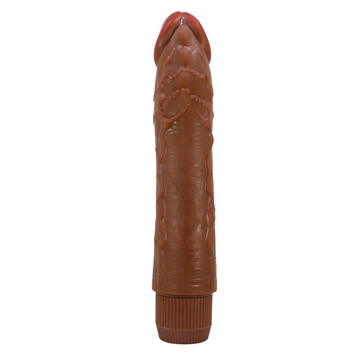 Stor tyk dildo i mørk naturfarve, dildoen er lavet i blødt materiale og er fleksibel. Dildoen er med stimulerende vibration der er pirrerende ved brug. Overfladen på dildoens skaft dækket med kraftige vener, den ender ud i et glansformet hoved. Vibratoren er med trinløs multi-speed vibration der indstilles ved drejning på enden af skruelåget i bunden. Husk at bruge glidecreme til sexlegetøj for optimal stimulering under leg, til denne model anbefaler vi at du bruger vandbaseret for en mere realistisk følelse ved brug. Denne nye udgave er udstyret med endnu bedre vibrator samt super soft overflade.