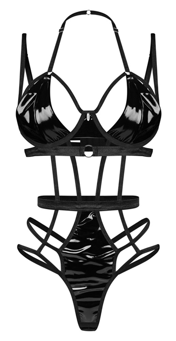 Sort Keira Lise g-strengskrop fra Obsessive med et iøjnefaldende stroplook. De bløde stretchstropper er stilfuldt kombineret med dekorative ringe og skinnende lakindsatser. Halterneck og stropper er justerbare, og det samme er hægtelukningen bagpå. Der er også et spænde på taljeremmen bagpå.