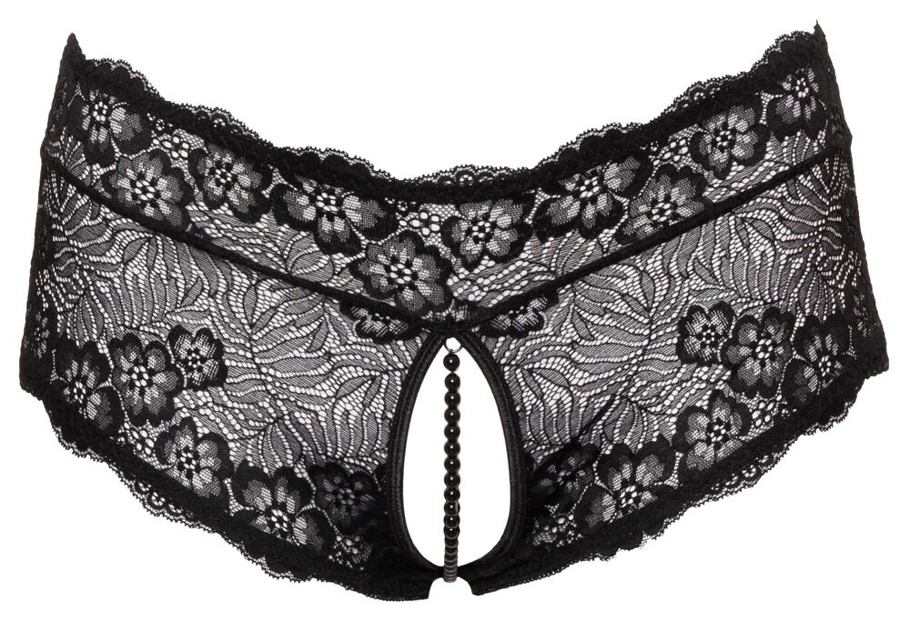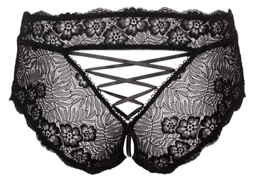 Sort blonde trusse i regulær talje snit, i bundløs design. Denne elegante trusse er lavet i en feminin sort blonde med god elastik, trussen er ekstra høj og har ekstra vidde i siderne for en behaglig pasform. Trussen har snøreeffekt bagpå og er udsmykket med en sort perlesnor foran (kan let fjernes hvis man ikke bryder sig om den). En fræk trusse til kvinder med frodige former.