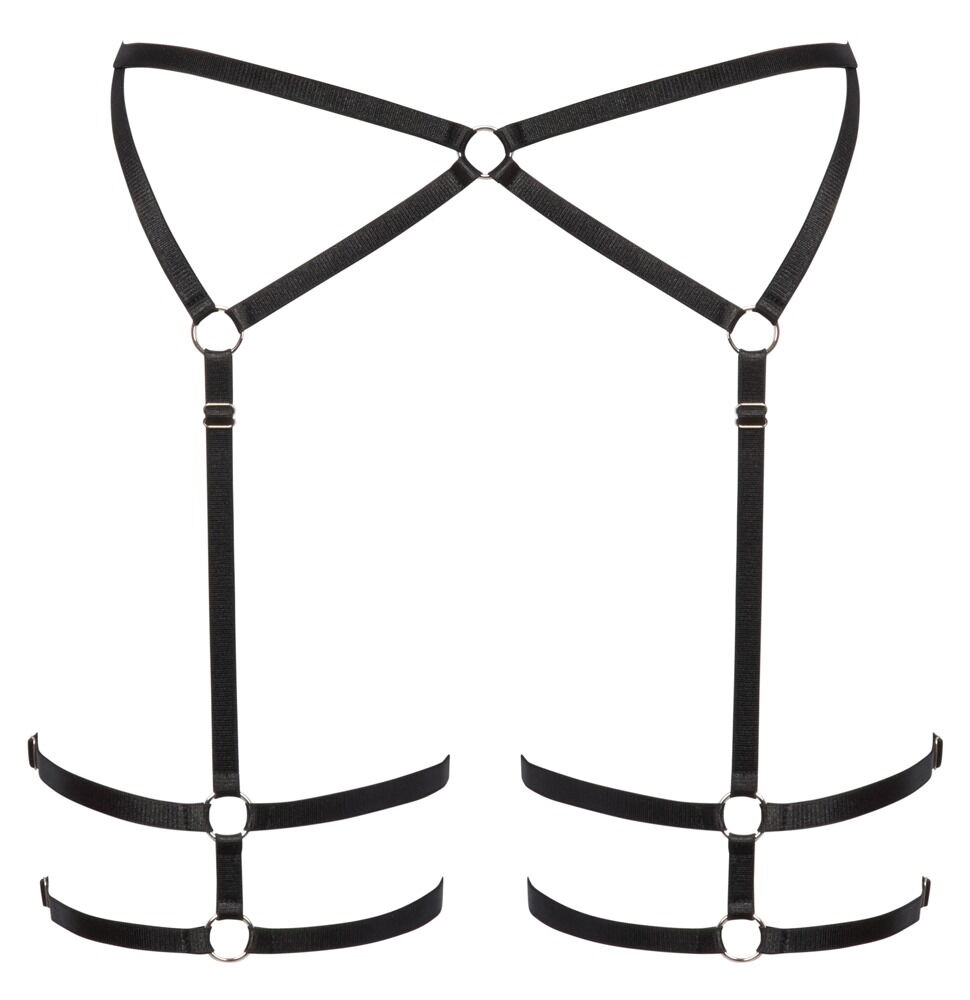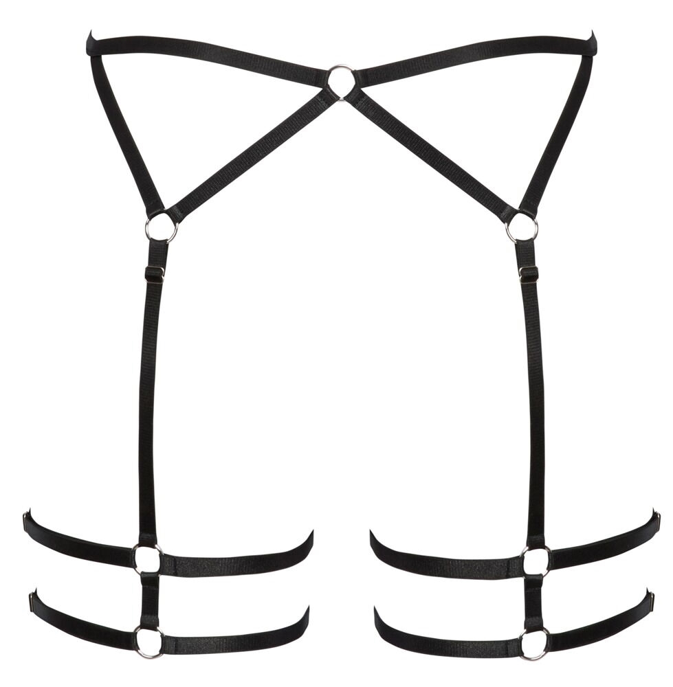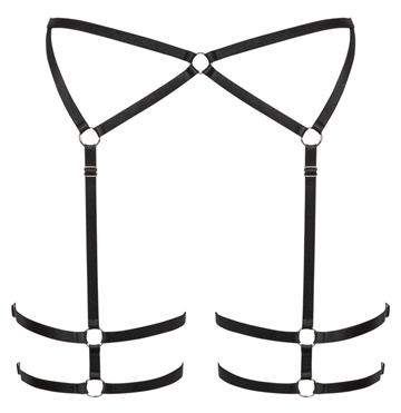 Sort lingerie harness der fremhæver din talje, hofter og numse på en særlig erotisk måde. Stropperne er fleksible, bløde og de strækker sig. Sammensat af enkle sølvfarvede ringe, gør designet elegant. Stropperne der går nedover lårerne kan justeres i længden, og den om lårerne kan reguleres i omkredsen for optimal pasform.