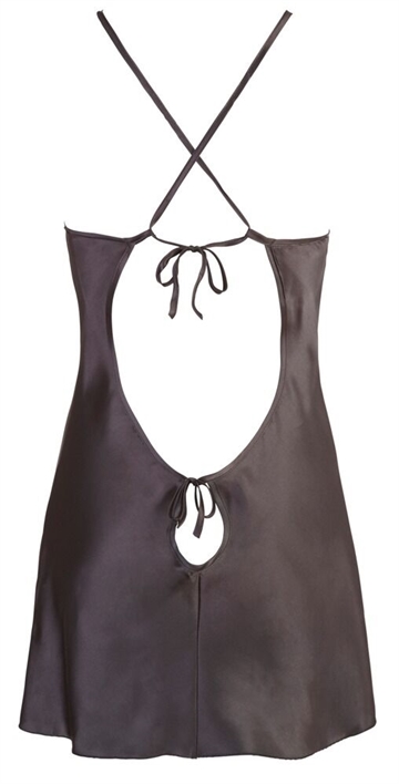 Klassiske sort neglige natkjole i sort blankt satin. Kjolen er med åben ryg, den er med bindebånd og stropperne justeres bagpå. Vi anbefaler at vaske kjolen inden brug, da den er med stivelse så den ikke krøller i æsken.