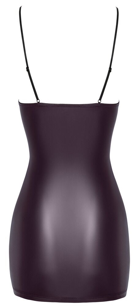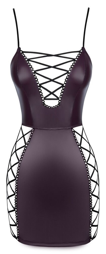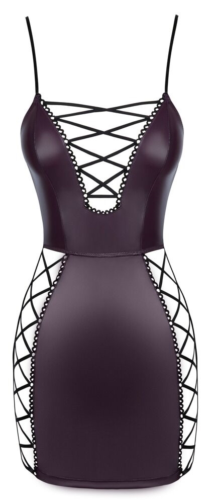 Kort mini kjole i lilla læderlook stof i åbent snørelook med dyb nedringning. Denne korte lille klub kjole er lavet i matteret læderlook stof, i en flot lilla farve. Kjolen er med store udskæringer i begge sider samt en dyb nedringning foran, alle holdt sammen af sort elastiksnor. Kjolen er med justerbare stropper.