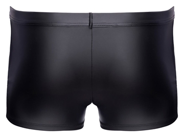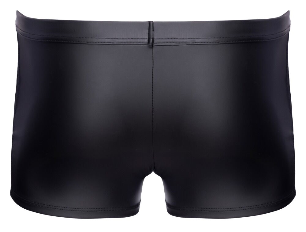 Sorte herre underbukse shorts i matteret læderlook stof, designet med metallic blå wetlook detaljer og sort mesh stof i siderne. Shortsene er med en bred elastik foroven, transparent mesh stof indsatser i begge sider og så er de pyntet med en sillebens mønster foran på lårerne og henover pouchen, disse detaljer er lavet i en metallik lillablå farve.