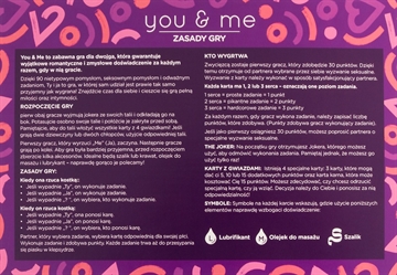 Det spændende parspil you & me med 90 innovative erotiske ideer, sexede forslag og eventyrlige aktiviteter. I dette sofistikerede spil er det lige så spændende og stimulerende at deltage som at vinde!