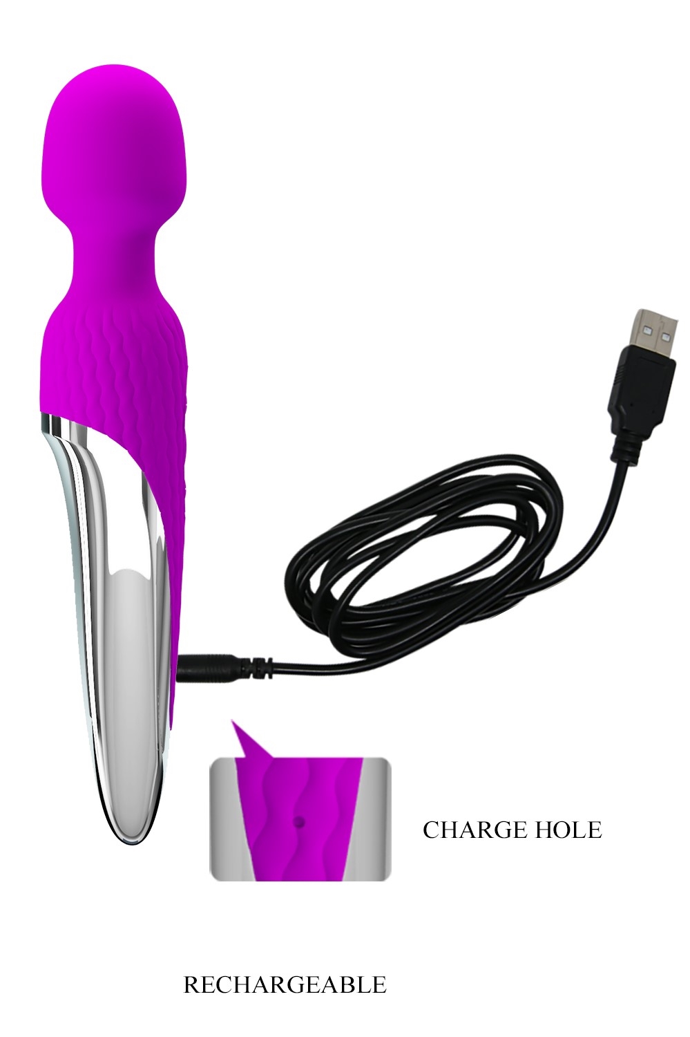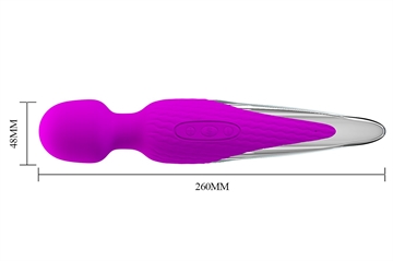 Cerise farvet magic wand, lavet i helstøbt form og med kraftigt hoved. En massiv wand for en ultimativ kraftig klitoris stimulation. Denne wand har 7 forskellige vibrations indstillinger, alle med 5 hastigheder, der let og nemt kan skiftes imellem. Vibratoren er genopladelig. Vibrationerne er tunge og dybe, de er masserende og kan mærkes dybt, denne wand er dejlig kraftig. Denne wand fra Pretty Love er belagt med medicinsk silikone, det at wanden er dækket af silikone gør at den er lettere at rengøre - der er ingen riller, åbninger & vand følsomme områder omkring hovedet. Wanden har 7 forskellige vibrationer og er genopladelig. Pres ikke hovedet ind imod, men holdt den let imod huden for et hårdere og kraftigere vibrationsslag.