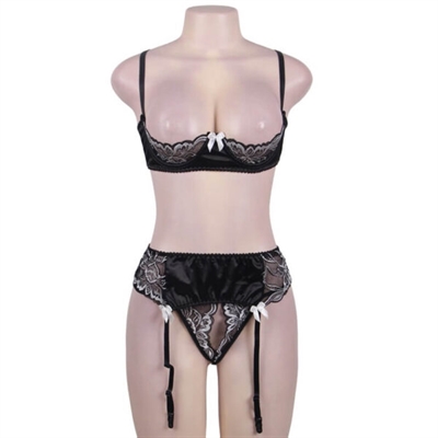 Sort lingerie sæt i satin look med lys sølv blonde.