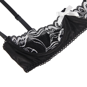 Sættet er bestående af 3 dele. En short underbust bh uden skål med hægtelukning bagpå og justerbare stropper, En bred hofteholder med hægtelukning bagpå og justerbare hofteholderstropper samt en åben g-streng i matchende blonde.