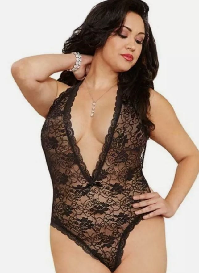 RED LACE HALTER TEDDY PLUNGING FRONT NECKLINE & CUTOUT HEART DETAIL BACK Plus Size
