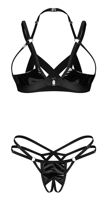 Ouvert sæt Keira Lise fra Obsessive med brystfri lift-up-bh og skridtløs g-streng. Dristig stil i skinnende sort vinyl med sølvfarvet tilbehør. Kombineret med smalle og brede stretchstropper, der indrammer kurverne perfekt. Alt sammen blødt og elastisk for en høj grad af komfort. Vinyl-bh med spænde foran mellem skålene og ved halterneck. Stropperne kan justeres, så de passer, ligesom stropperne i siderne af g-strengen. Vinylg-strengen forfører også med et åbent skridt.